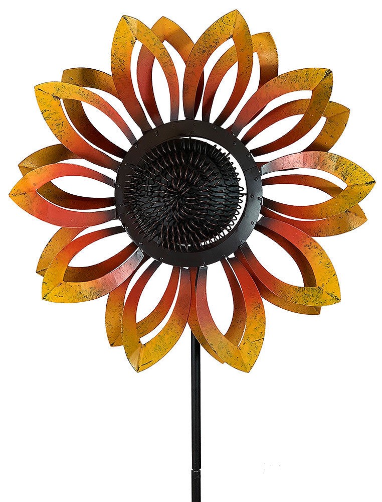 Das Doppelwindrad in Sonnenblumen-Optik wird durch seine toll geschwungene Form und der außergewöhnlichen Laufrichtung der Räder zu einem zauberhaften Dekoaccessoire für Terrasse und Garten! Die beiden Räder bewegen sich gegenläufig und erzeugen dadurch einen besonders kunstvollen Effekt. Das Windrad ist aus Metall gefertigt und rot, gelb, braun lackiert. Die dezenten Farbunterschiede in der Lackierung verleihen dem Windrad einen schönen Vintage-Look. Die gegensätzliche Laufrichtung der beiden Räder sorgt für einen wunderschönen, optischen Effekt. Der Gartenstab kann einfach an beliebiger Stelle in den Boden gesteckt werden. Maße: (Gesamthöhe x B x T) ca. 180 x 45 x 21 cm.