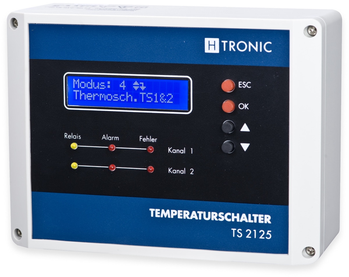 Der neue 2-Kanal Temperaturregler TS 2125 eignet sich hervorragend für alle Einsatzbereiche, bei denen eine Temperaturregelung im Heiz- oder Kühlbetrieb erforderlich ist. Ein externer Temperatursensor erfasst Messbereiche von –99 bis +125°C. Das Gerät ist nicht nur übersichtlich und einfach in der Handhabung, sondern auch sicher in der Anwendung, denn Fühlerkurzschluss und Fühlerunterbrechung werden sofort erkannt. Der Thermoschalter kann eigenständig eingesetzt werden, aber auch als Ersatz für defekte mechanische Thermostate oder für Digitalthermometer dienen. Features: Schalttemperatur von –55 … +125 °C frei einstellbar Hysterese frei einstellbar Min-/Max.-Anzeige Fühlerüberwachung auf Kurzschluss und Unterbrechung Relaiszustand bei Fühlerfehler einstellbar LED-Anzeigen für Relais ein, Fühlerfehler und Alarm Fernmessung bis 50 m möglich 7 Betriebsarten Technische Daten: Betriebsspannung: 100…230 V~ Ausgangsspannung: max. 3 kW Leistungsaufnahme: ca. 3 VA Messbereich: -55…+125°C Genauigkeit: +/-0,5°C…+/-2°C Auflösung : 0,1 °C Schutzart: Ip20 Maße (HxBxT): 160x120x60 mm Lieferumfang: Temperaturschalter Temperatursensor Metall mit Befestigungslasche Steckbares 2 m Anschlusskabel Betriebsanleitung
