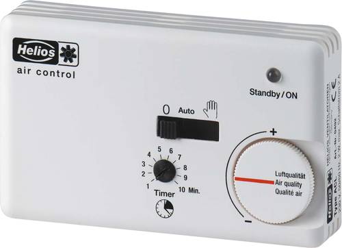 Elektronischer Luftqualitätsregler zur Steuerung eines oder mehrerer 1- und mittels Schaltschütz 3-Ventilatoren. Ein/Ausschalt-Funktion in Abhängigkeit der Raumluftgüte (Sensor für oxidierbare Gase und Geruchsstoffe). Einstellbare Nachlaufzeit 1-10 min., Einschaltverzögerung ca. 5 sec. Flaches AP-Gehäuse, hellgrauer Kunststoff, Schutzart IP 30. 230 V~, 50/60 Hz, I max. 2 A induktiv.