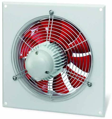 Axial-Hochleistungsventilator mit quadratischer Einbauplatte, Einströmdüse, direkt angetrieben. Quadratische Einbauplatte mit angeformter Düse aus verzinktem Stahlblech, zweifach lackiert, Farbe papyrusweiß. Laufrad mit Hochleistungs-Charakteristik mit profilierten Schaufeln aus Kunststoff, aerodynamisch auf die Anwendung optimiert, dynamisch ausgewuchtet. Drehstrom-Kurzschlußläufer-Motor zweitourig mit Stern-Dreieck-Schaltung, geschlossene Bauweise, wartungsfrei, gedichtete, geräuscharme Kugellager mit Langzeitschmierung.