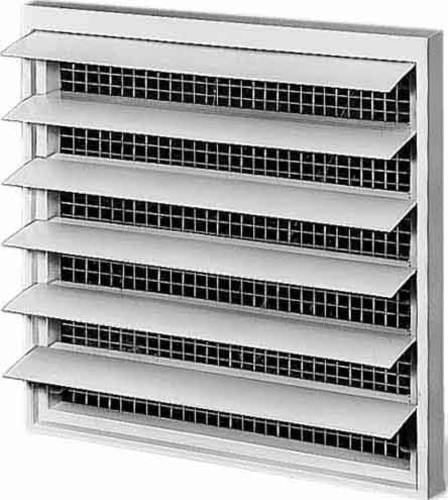 Abdeckung von Luftein- und Luftaustrittsöffnungen an Fassaden zum Schutz gegen Eindringen von Regen und Schnee. Aus Kunststoff, Farbe hellgrau. Feststehende Lamellen und Rahmen aus UV-beständigem, bruchfestem Kunststoff mit hinterlegtem Maschendrahtgitter aus verzinktem und kunststoffbeschichtetem Stahl, Maschenweite 8 mm. Einfache Montage durch Dübeln.