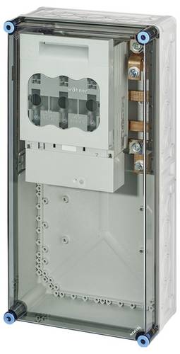 Gehäuse für den Bau von Energie-Schaltgerätekombinationen bis 630 A oder als Einzelgehäuse. Aus hochwertigem Polycarbonat schutzisoliert. Wanddurchführungen mit großen Öffnungen für die elektrische Verbindung der Gehäuse untereinander. Kabeleinführung an allen Gehäusewänden über metrische Vorprägungen oder Anbauflansche. Gehäuse zur Wandbefestigung auch über Außenlaschen oder mit Montageschienen. Gehäuse mit Sicherungslasttrennschalter NH 1, 3-polig, nach IEC 60947-3 auf Sammelschienen. Ohne Zuleitungsklemmen. Mit PE- und N-Klemmen. Anschlussrichtung veränderbar. Deckelverschlüsse für Werkzeugbetätigung.