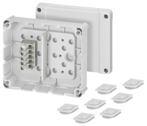 Kabelabzweigkästen aus hochwertigem Thermoplast. Für Aufputz-Anwendungen in Gebäuden oder die geschützte Installation im Freien, geeignet für die Kabelkanal- und Rohrinstallation. Durch ausschneiden der Kabelkanalwand und den beigefügten Einschubstopfen können die Kabel von vorn eingelegt werden, kein Fädeln notwendig. Deckelbefestigung mit V2A-Schrauben. Mit Schraubklemmen bis 2,5 mm², 5-polig.