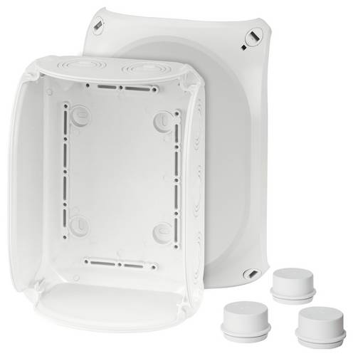 Kabelabzweigkasten aus hochwertigem Thermoplast. Für Aufputz-Anwendungen in Gebäuden oder die geschützte Installation im Freien. Mit Außenlaschen zur Befestigung und Deckelbefestigung über Schnellverschlüsse. Kabelabzweigkasten ohne Klemmen. Kabeleinführung über metrische Vorprägungen in Gehäusewänden und Boden. Beigefügte Einsteckstutzen in Schutzart IP 55.