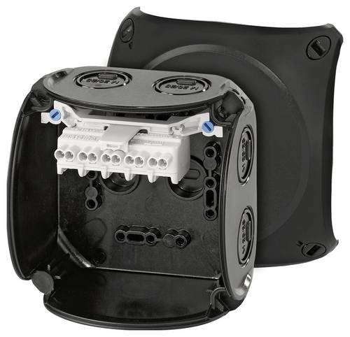 Kabelabzweigkasten aus hochwertigem Thermoplast für die ungeschützte Installation im Freien oder Aufputz-Anwendungen in Gebäuden. Beständig gegen Witterungseinflüsse wie UV-Belastung durch Sonneneinstrahlung, geschützt gegen Regenwasser, temperaturbeständig und schlagfest. Deckelbefestigung über Schnellverschlüsse. Mit Außenlaschen zur Befestigung. Seewasserbeständig, für Offshore-Anwendungen. Mit Zulassung für die Installation auf Schiffen. Klemme mit 2 Klemmstellen je Pol bis 2,5 mm², 5-polig. Kabeleinführung über metrische Vorprägungen. Anbau-Kabelstutzen im Zubehör. Mit Deckelhalteband.