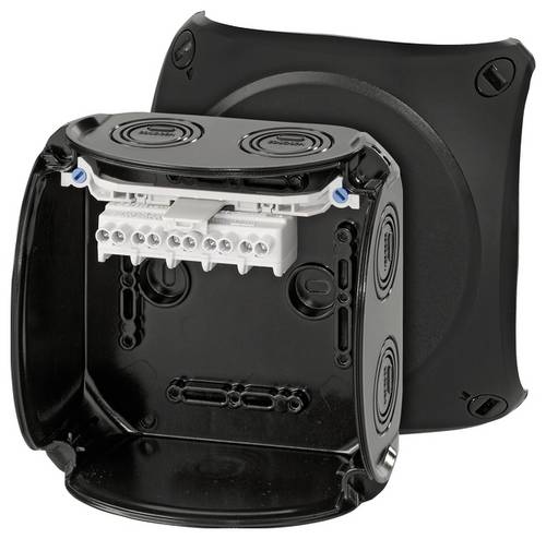 Kabelabzweigkasten aus hochwertigem Thermoplast für die ungeschützte Installation im Freien oder Aufputz-Anwendungen in Gebäuden. Beständig gegen Witterungseinflüsse wie UV-Belastung durch Sonneneinstrahlung, geschützt gegen Regenwasser, temperaturbeständig und schlagfest. Deckelbefestigung über Schnellverschlüsse. Mit Außenlaschen zur Befestigung. Seewasserbeständig, für Offshore-Anwendungen. Mit Zulassung für die Installation auf Schiffen. Klemme mit 2 Klemmstellen je Pol bis 4 mm², 5-polig. Kabeleinführung über metrische Vorprägungen. Anbau-Kabelstutzen im Zubehör. Mit Deckelhalteband.