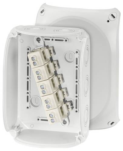 Kabelabzweigkasten aus hochwertigem Thermoplast für die ungeschützte Installation im Freien oder Aufputz-Anwendungen in Gebäuden. Beständig gegen Witterungseinflüsse wie UV-Belastung durch Sonneneinstrahlung, geschützt gegen Regenwasser, temperaturbeständig und schlagfest. Deckelbefestigung über Schnellverschlüsse. Mit Außenlaschen zur Befestigung. Seewasserbeständig, für Offshore-Anwendungen. Mit Zulassung für die Installation auf Schiffen. Klemme mit 2 Klemmstellen je Pol bis 10 mm², 5-polig. Kabeleinführung über metrische Vorprägungen in Gehäusewänden und Boden. Anbau-Kabelstutzen im Zubehör. Mit Deckelhalteband.