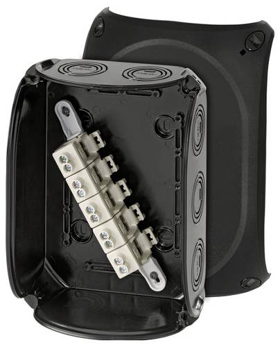 Kabelabzweigkasten aus hochwertigem Thermoplast für die ungeschützte Installation im Freien oder Aufputz-Anwendungen in Gebäuden. Beständig gegen Witterungseinflüsse wie UV-Belastung durch Sonneneinstrahlung, geschützt gegen Regenwasser, temperaturbeständig und schlagfest. Deckelbefestigung über Schnellverschlüsse. Mit Außenlaschen zur Befestigung. Seewasserbeständig, für Offshore-Anwendungen. Mit Zulassung für die Installation auf Schiffen. Klemme mit 2 Klemmstellen je Pol bis 10 mm², 5-polig. Kabeleinführung über metrische Vorprägungen in Gehäusewänden und Boden. Anbau-Kabelstutzen im Zubehör. Mit Deckelhalteband.