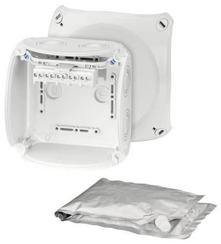 Kabelabzweigkasten aus hochwertigem Thermoplast zum Vergießen für eine wasserdichte Verbindung. Für die ungeschützte Installation im Freien bei Gefahr von Kondenswasserbildung und/oder Eintritt von Flüssigkeiten, zur Montage im Erdreich ohne Verkehrslasten. Verwendbar für Heizkabel / Heizband bis max. 70 °C Oberflächentemperatur. Für Nachinstallationen oder Prüfungen kann der Deckel abgenommen und die Vergussmasse entfernt werden. Deckelbefestigung über Schnellverschlüsse. Mit Außenlaschen zur Befestigung. Mit Klemmen bis 4 mm², 5-polig. Kabeleinführung über metrische Vorprägungen in Gehäusewänden. Anbau-Kabelstutzen im Zubehör. Mit Vergussmasse und Verschlussstopfen.