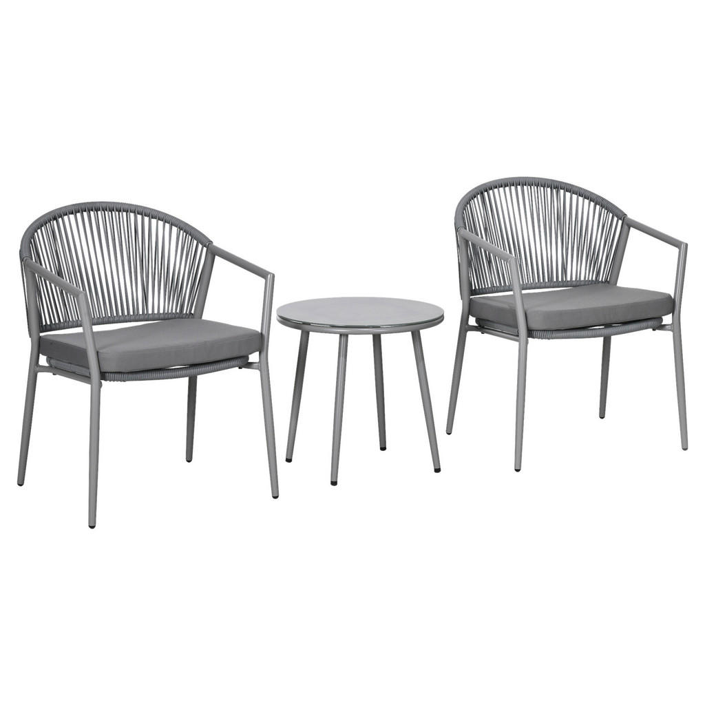 Gemütliche Gartengarnitur: Zwei bequeme Stühle und ein runder Beistelltisch in Rattanoptik laden zum Verweilen ein. Genießen Sie entspannende Momente im eigenen Garten und lassen Sie die Seele baumeln Himmlischer Sitzkomfort: Jeder Stuhl verfügt über ein großzügig gepolstertes Sitzkissen, das für maximalen Sitzkomfort sorgt und Sie bequem beim Erholen unterstützen wird Robuste Konstruktion: Dank des pulverbeschichteten Stahlrahmens ist Stärke und Zuverlässigkeit garantiert. Dach hochwertige Kunstrattan rundet das wunderbar charaktervolle Gesamtbild gekonnt ab. Freuen Sie sich auf eine langlebige und charmante Gartenmöbelgarnitur Eleganter Tisch: Dieser Tisch ist mit einer Hartglasplatte ausgestattet, die dem grauen Rattan-Möbelset eine elegante Note verleiht. Gleichzeitig ist die Glasplatte leicht zu reinigen und sauber zu halten Produktmaße: Stuhl: 58B x 62T x 78H cm, Tisch: Ø 48 x 46H cm, Belastbarkeit 120 kg (Stuhl), 50 kg (Tisch), Montagezeit: 1 Stunde (mit 2 Personen) Beschreibung: – Dekoratives Gartenmöbelset aus zwei Stühlen und einem runden Tisch in Rattanoptik; – Himmlischer Sitkomfort durch weiche Sitzpolster; – Der pulverbeschichtete Stahlrahmen sorgt für hohe Langlebigkeit; – Hochwertige Verkleidung aus Kunstrattan besticht mit einer charaktervollen Note; – Die leicht zu reinigende Tischplatte aus Hartglas bietet eine elegante Abstellfläche für Getränke & Snacks; – Dank der abnehmbaren Kissenbezüge ist eine einfache Reinigung möglich; – Rutschfeste Füße bieten Standfestigkeit und schützen Bodenbeläge; – Montage erforderlich; Technische Daten: – Farbe: Grau – Material: Stahl, PE-Rattan, 100% Polyester, Hartglas – Stuhlmaße: 58B x 62T x 78Hcm – Tischmaße: Ø 48 x 46Hcm – Sitzgröße: 45B x 45T x 40Hcm – Rückenlehnengröße: 43B x 52T x 40Hcm – Sitzkissengröße: 48L x 46B x 5Tcm – Anzahl der Personen für Montage: 2 – Montagezeit: