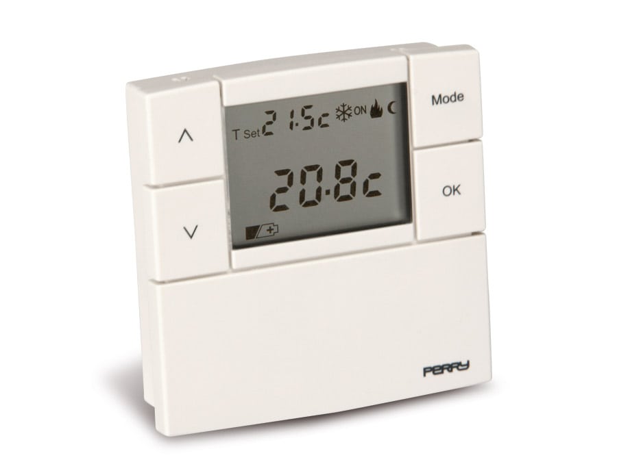Formschöner, elektronischer Raumtemperaturregler mit Display und Wechslerkontakt für universellen Einsatz. Farbe weiß. Technische Daten: Betrieb mit 2 Micro-Batterien (Lebensdauer bis zu 2 Jahre!) “Batterie entladen” Anzeige schon 1 Monat vor restlos leerer Batterie potentialfreier Wechsler-Schaltkontakt (Relais) Schaltleistung 5(3) A/250 V~ Schutzart Ip30 Temperatur-Regelbereich +5…37,7 °C Auflösung 0,1 °C Arten der Temperaturregelung: On/Off mit einstellbarem Differential (0,2…1,2 °C) oder proportional mit Kontrollzeitraum (7…20 min)- 2 Temperaturniveaus + Frostschutz-Funktion Sommer-/Winterbetrieb Aufputz-Montage (über einer Schalterdose montierbar) Maße (BxHxT): 84x84x23 mm Lieferumfang: Raumthermostat, Schrauben, Dübel, Anleitung.