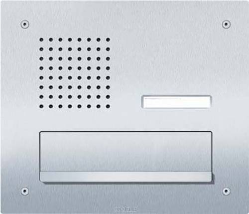 Classic Durchwurfbriefkasten für das 1+n System mit Edelstahl-Front, V4A gebürstet, ohne Gehäuse zur Montage auf vorhandenes Unterputzgehäuse der Baureihe TL 411. Türlautsprecher mit einer Ruftaste und einer Briefeinwurfklappe mit Griffleiste.
