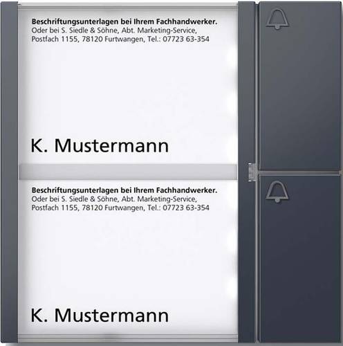 Bus-Tasten-Modul mit Namensschildtasche, 2 Namensschildern und 2 separaten Ruftasten mit Glockensymbol.
