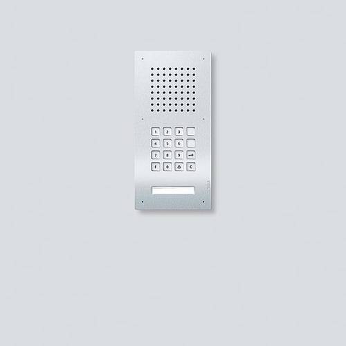 Classic-Türstation für den In-Home-Bus mit Edelstahl-Front, V4A gebürstet. Türlautsprecher, 1 Ruftaste mit hinterleuchtetem Namensschild, frontseitig auswechselbar. Außerdem ist ein Codeschloss zur Zugangs-Kontrolle und für Steuerfunktionen eingebaut.