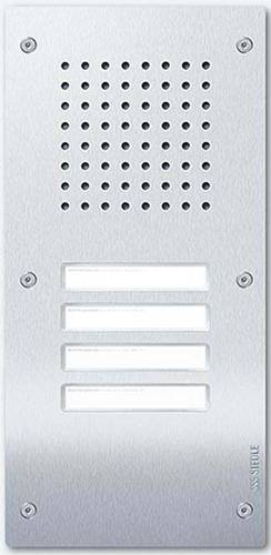 Classic-Türstation für den In-Home-Bus mit Edelstahl-Front, V4A gebürstet, ohne Gehäuse zur Montage auf vorhandenes Unterputzgehäuse Größe C der Baureihe TL 111. Türlautsprecher mit 4 Ruftasten.