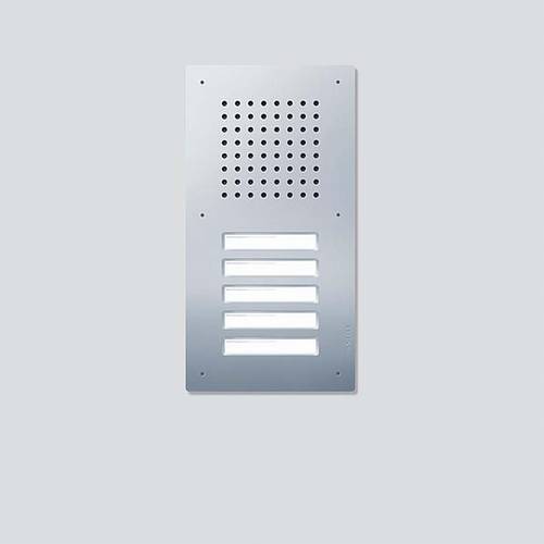 Classic-Türstation für den In-Home-Bus mit Edelstahl-Front, V4A gebürstet. Türlautsprecher, 5 Ruftasten mit hinterleuchtetem Namensschild, frontseitig auswechselbar.