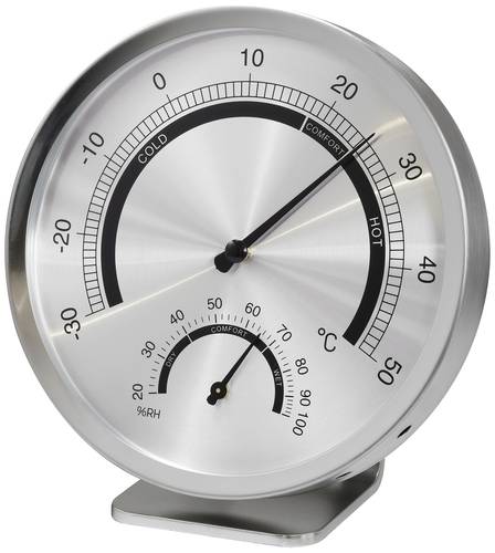 Zuverlässige analoge Temperatur- und LuftfeuchtemessungAuch in Zeiten umfassender Digitalisierung stellt die analoge Temperatur- und Luftfeuchtemessung mittels Bimetall die genaueste Methode dar. Darüber hinaus ist das Analoge Bimetall-Thermo-/Hygrometer mit seiner Komfortstufenanzeige, einem Gehäuse aus gebürstetem 403 Edelstahl und der aus getöntem Glas gefertigten Frontscheibe ein echter Hingucker. Abgerundet wird das Design durch eine Leiste aus gebürstetem Aluminium. Das Messgerät ist wandmontierbar oder kann mit dem abnehmbaren silbernen Ständer aus sprühlackiertem ABS an beliebiger Position aufgestellt werden.