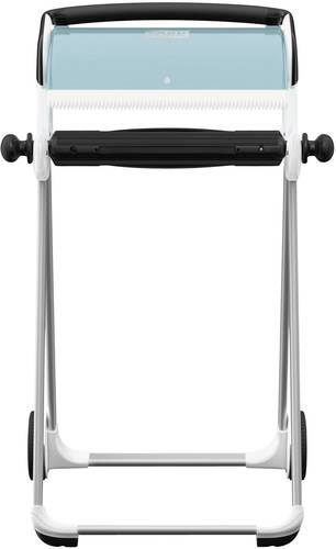 Mobiler Bodenständer mit ergonomisch geformten Griff und strapazierfähigen Rädern, moderne Farbgebung in weiß/ türkis für hygienesensible Bereiche, robuste Metallkonstruktion mit Gummifüßen für perfekten Stand, innovative Rollenhalterung für Rollen bis 43 cm Breite und für Hülsen-Ø zwischen 71 – 73 mm optimiert, glasfaserverstärkte Abreißkante, Abdeckhaube aus Kunststoff zum Schutz der Rolle, W1 System.