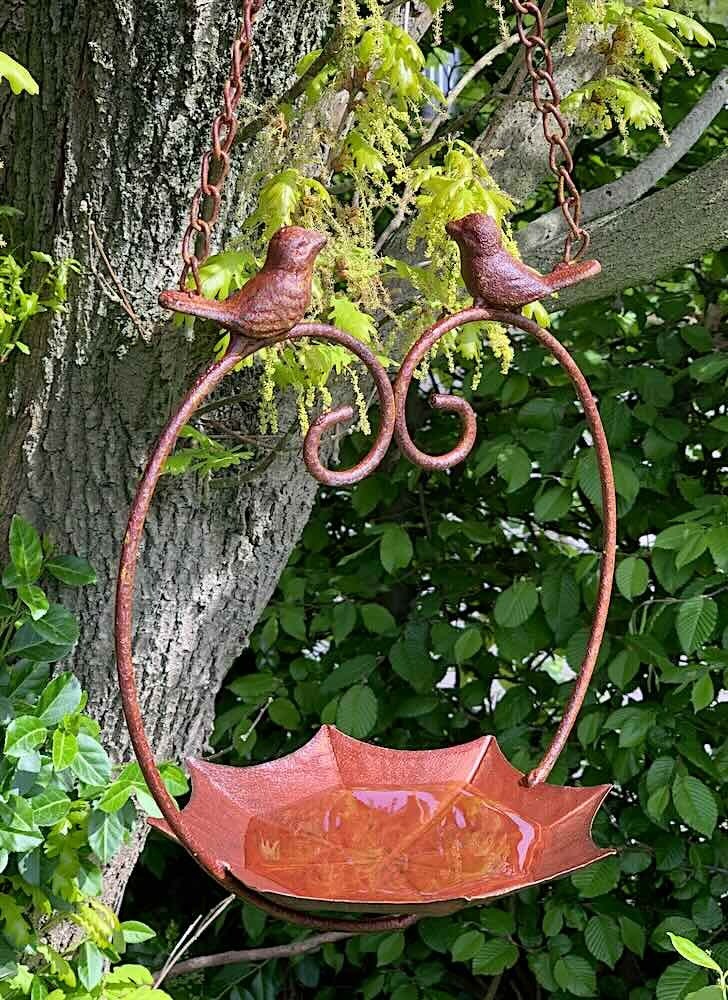 Vogeltränke Vogelbad zum Aufhängen – Diese wunderschöne Vogeltränke könnte aus einem herrlichen, alten Park stammen und verleiht jedem Ort eine zauberhafte Atmosphäre! Die Vogeltränke ist sehr detailliert, nach jahrhundert alter handwerklicher Tradition aus Gusseisen gefertigt und antik-braun lackiert. Die Schale sieht aus wie ein Seerosenblatt und ist ideal für Wasser oder Futter geeignet. Dank der Kette mit Haken kann die Vogeltränke an beliebiger Stelle aufgehangen werden. Die 2 Vogel-Figuren und der Bogen in Herzform runden das Design ab und machen die Schale zu einem echten Hingucker für Garten, Terasse oder Balkon! Maße Schale: (B/T/H) ca. 24 x 17 x 25 cm. Höhe mit Kette: ca. 58 cm.